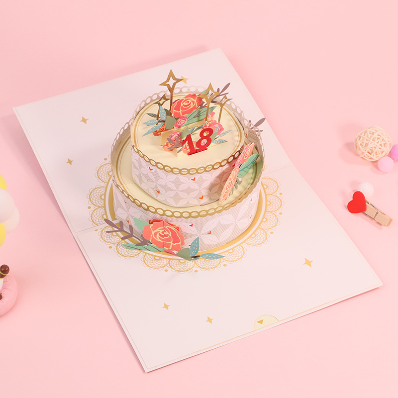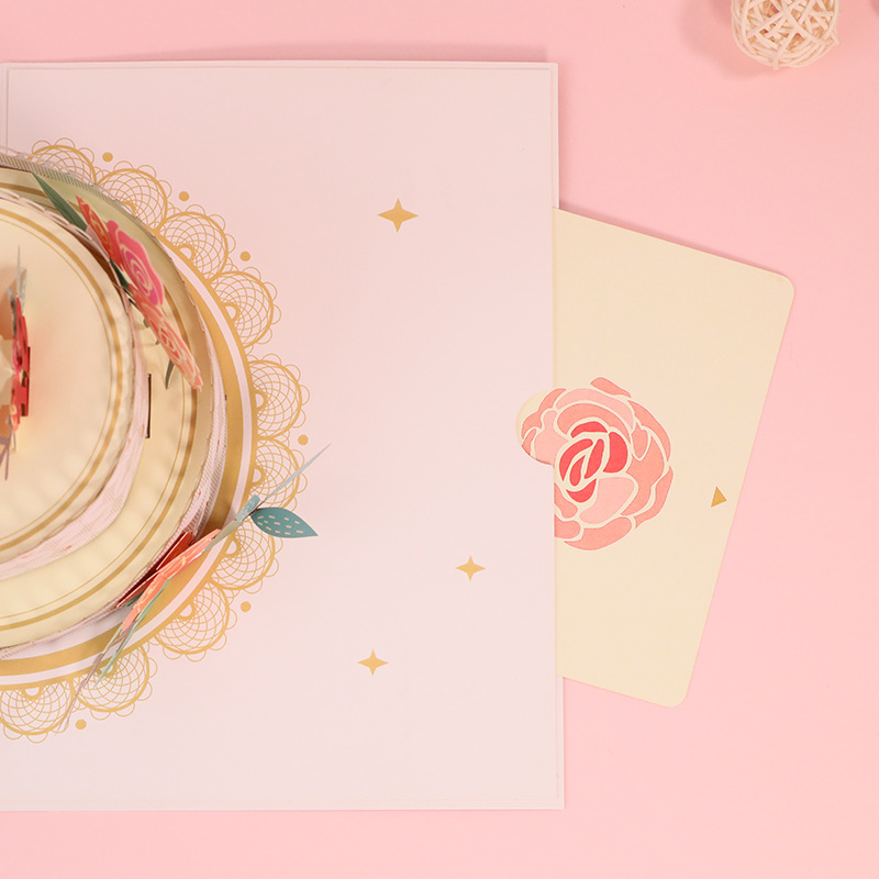 Double Layer Rose Cake Gilding Birthday Three-dimensional Greeting Card Handmade3 D Paper Carving Blessing Message Small Card