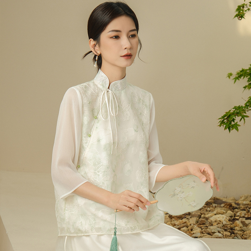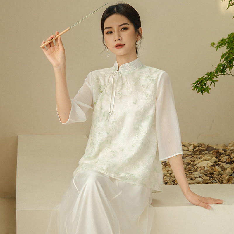 Spring And Summer Chinese Style Slanted Lapel Stand Collar Tops For Women, National Style Ethnic Clothing, Women's Zen Tea Clothes, Casual Home Clothes