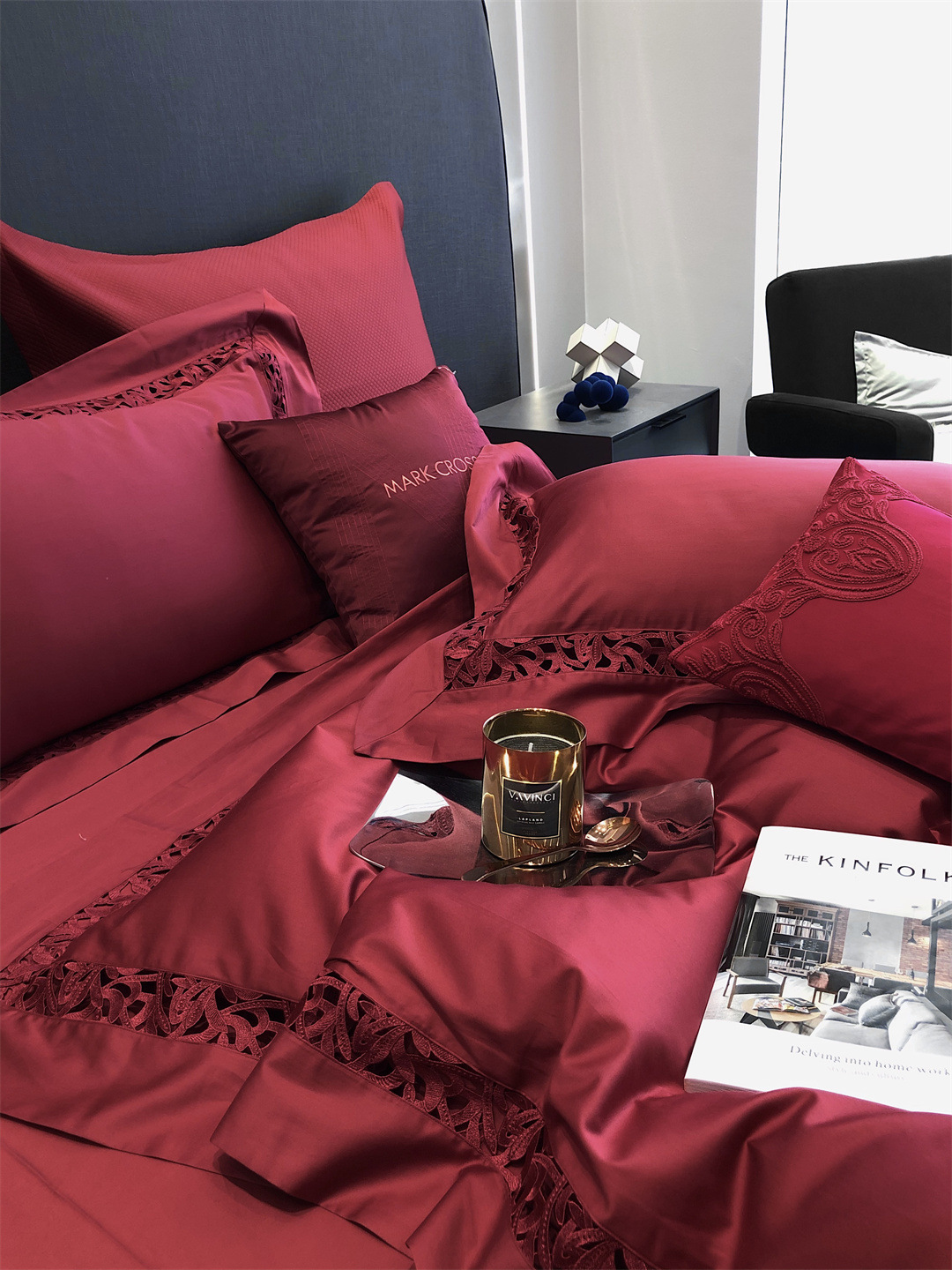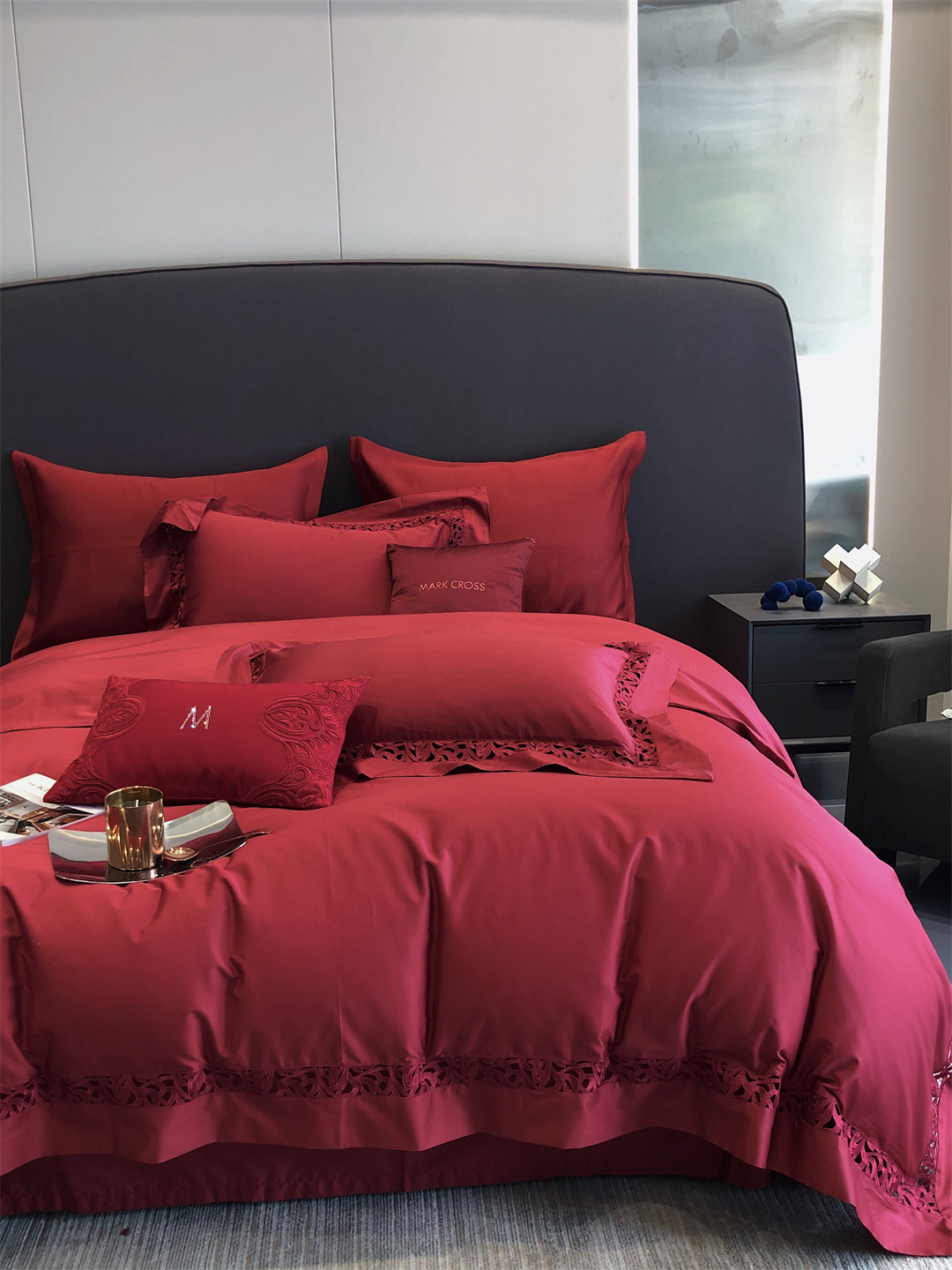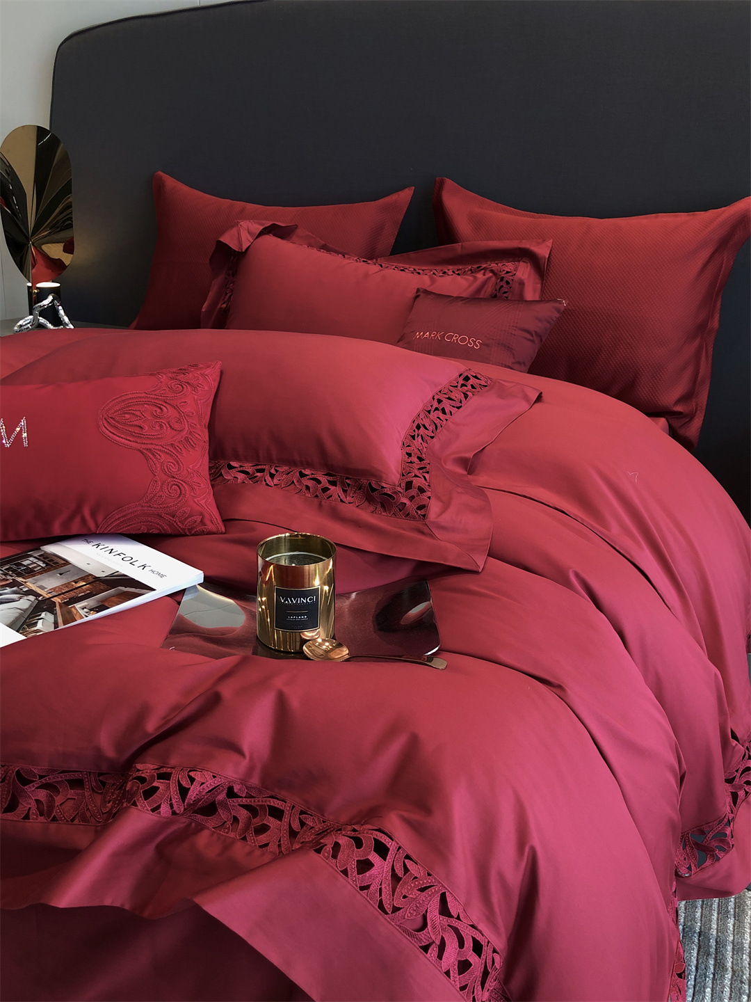 High-end Wedding Bright Red Solid Color Hollow Bedding Bedding S100 Pure Cotton Long-staple Cotton Four-piece Set Home Textile Carat