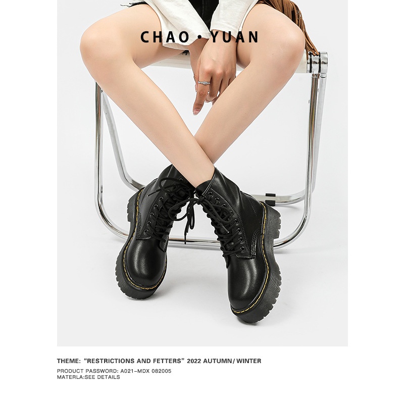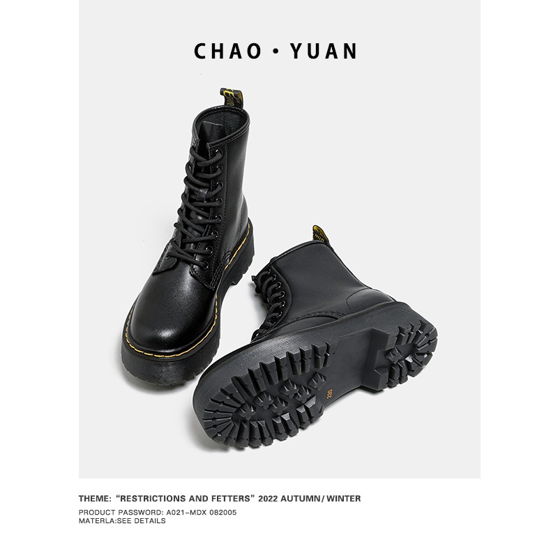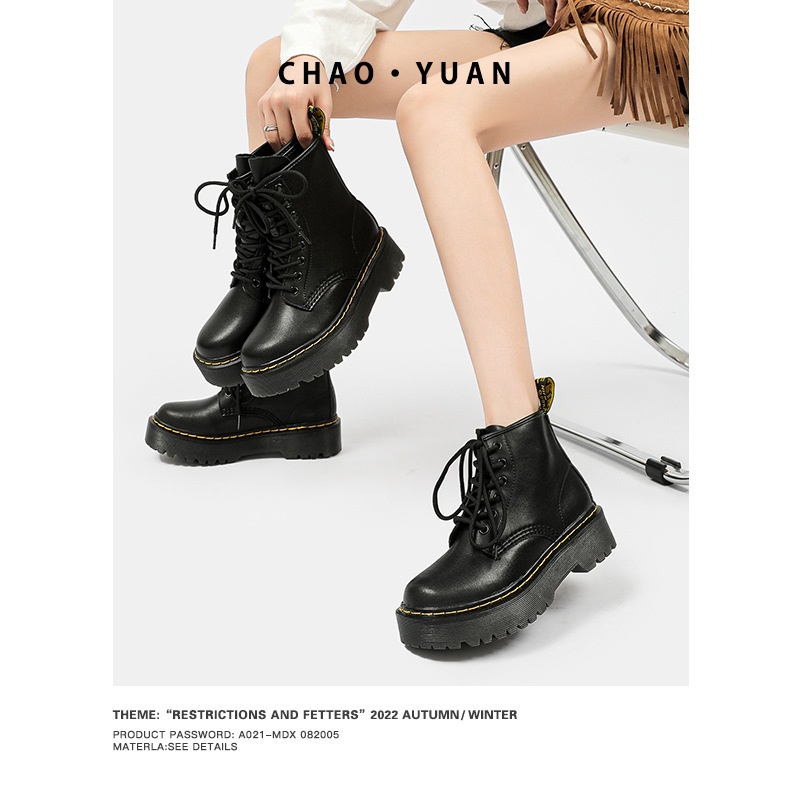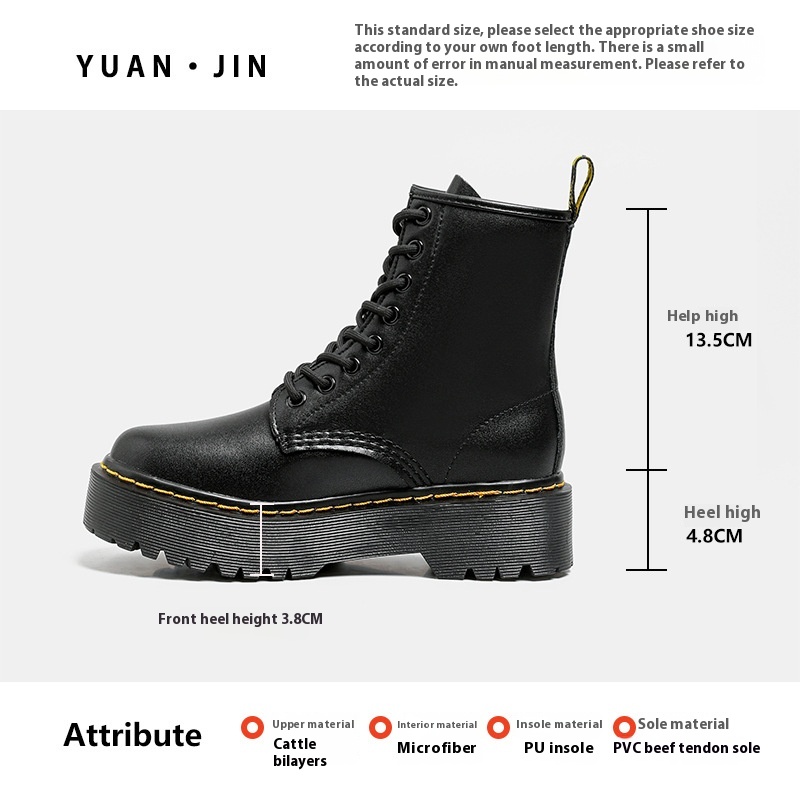 Super Yuan Thick-soled Martin Boots Women's Short Boots Winter Velvet Thickened Genuine Leather Black Boots Flat-soled Women's Leather Boots