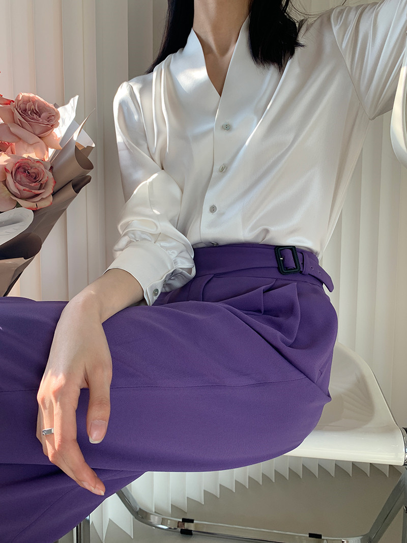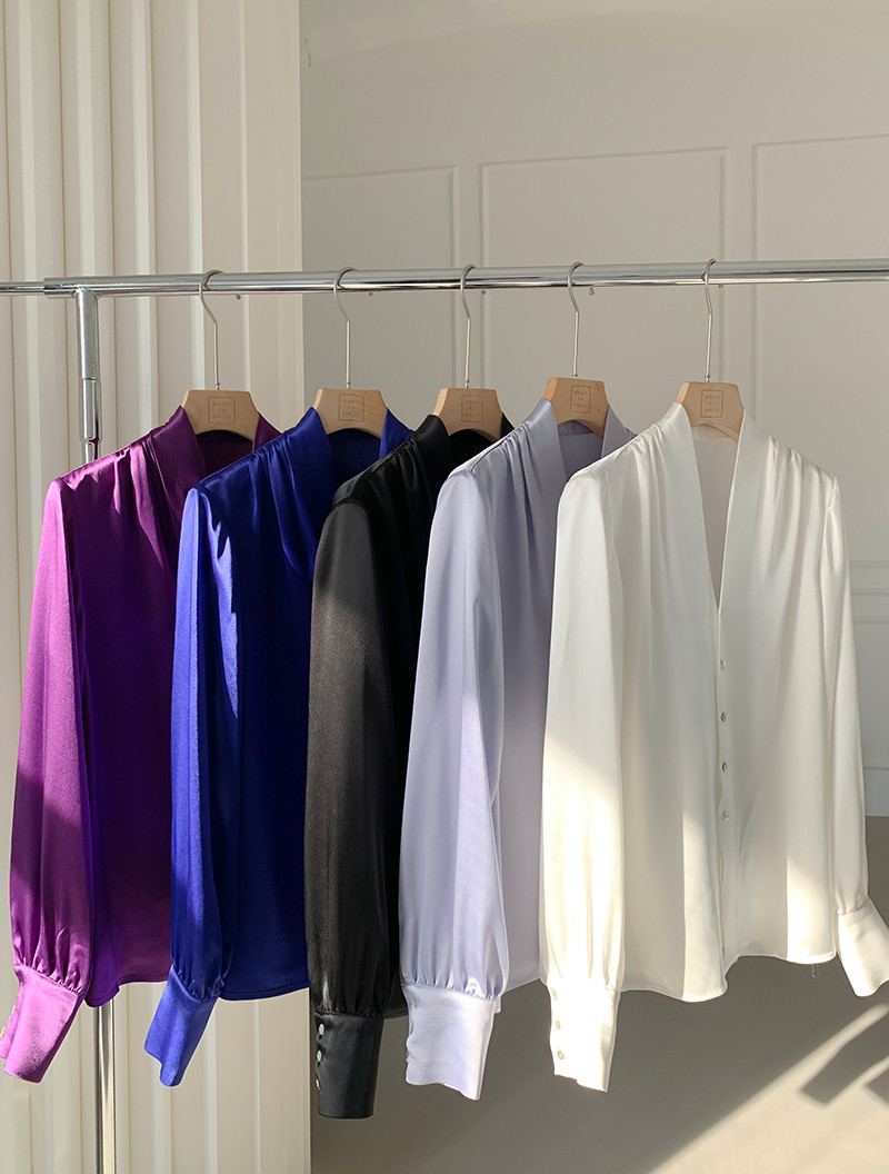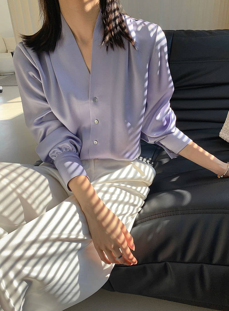 Light Luxury Triacetate Satin Pleated V-neck Single-breasted Elegant Shirt For Women Korean Version Commuting Long-sleeved