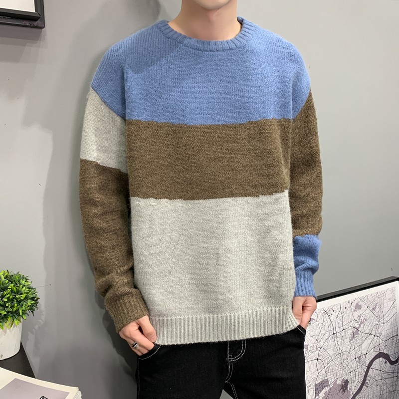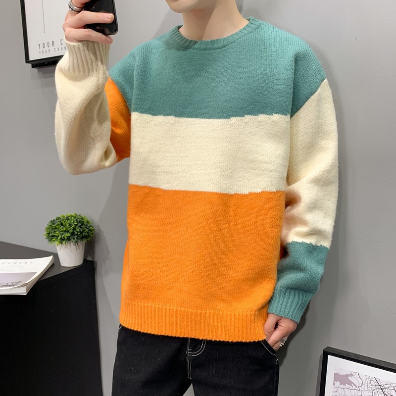 Autumn And Winter Korean Style Men's Round Neck Sweatery Color Block Pullover Sweater Casual Loose Teen Tops