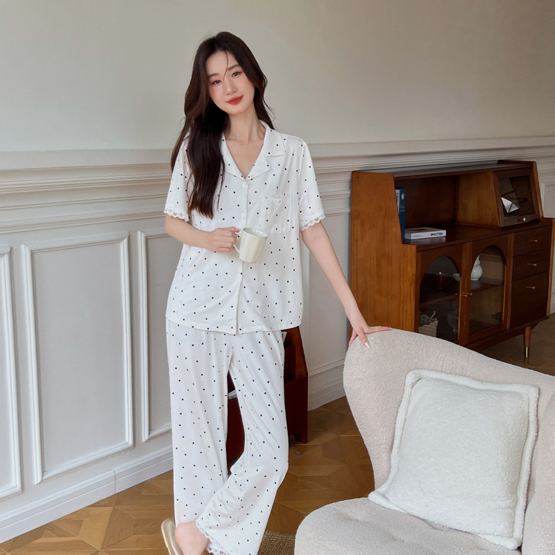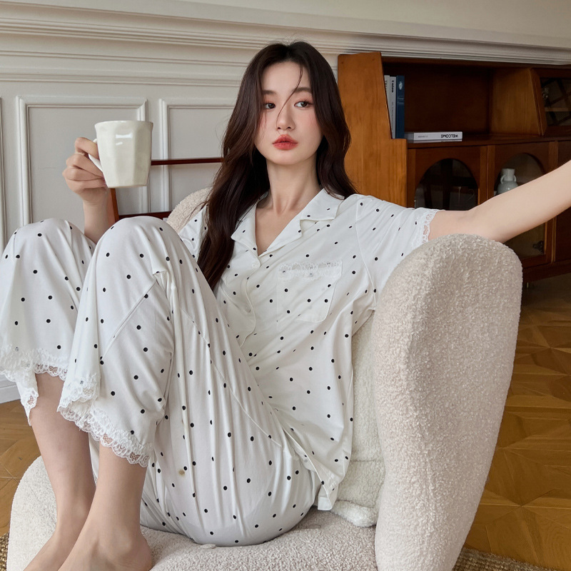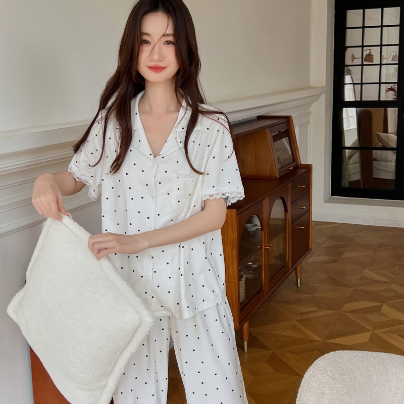 Pajamas For Women Spring And Summer Cotton Thin Short-sleeved Trousers Polka Dot High-end Home Clothes Two-piece Set