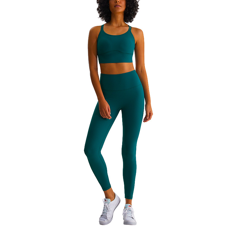 Ribbed Yoga Fitness Wear Two-piece High-waist Hip-lifting Elastic Shaping Leggings Sports Bra Set For Women