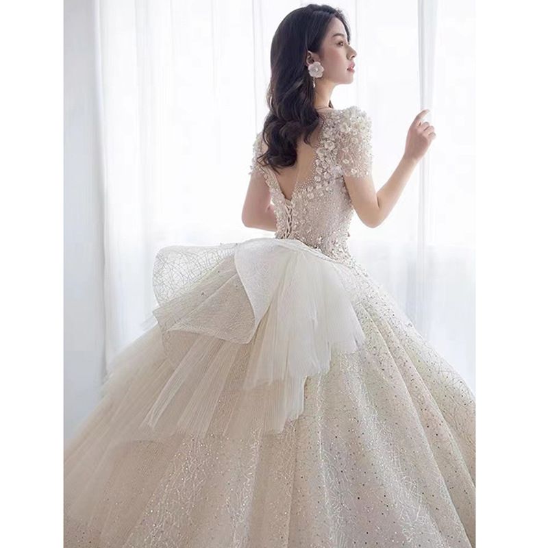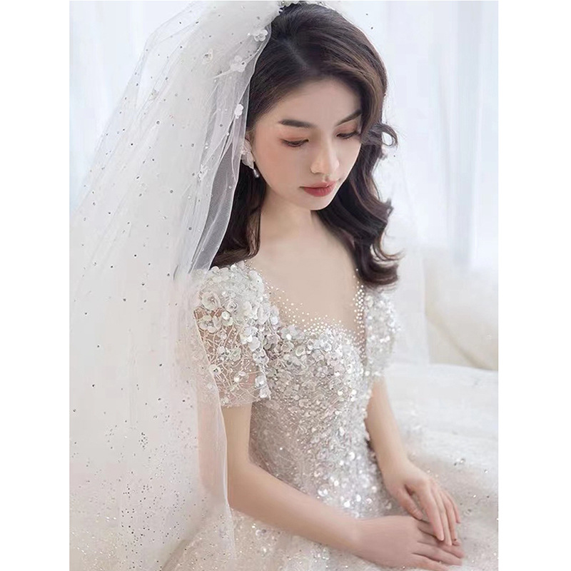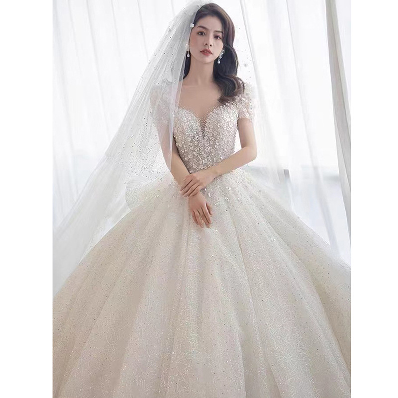 Summer V-neck Lace Sexy Wedding Dress Short-sleeved White Simple Lace Sequin Wedding Dress