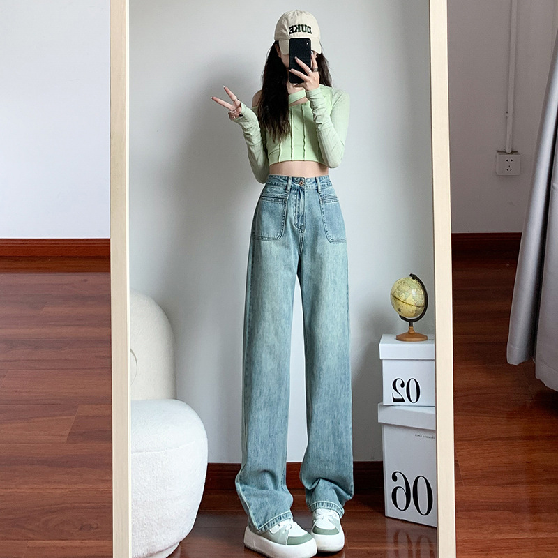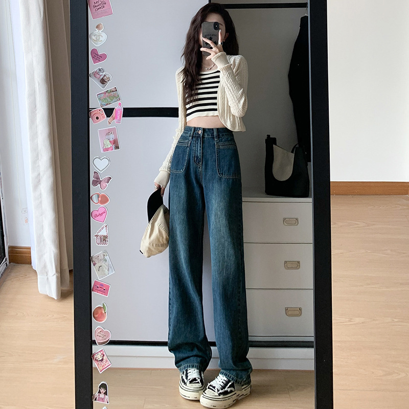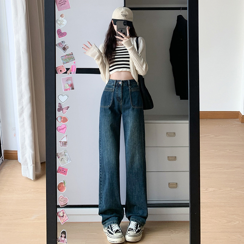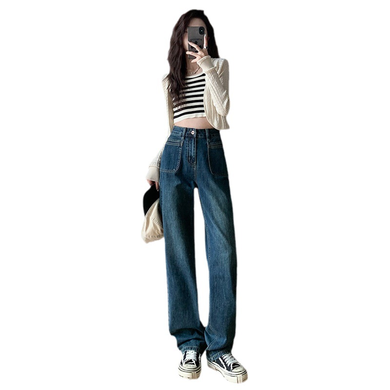 Fashion High Waist Retro Blue Jeans Women Spring Style Casual Loose Slim All-match Straight Trousers
