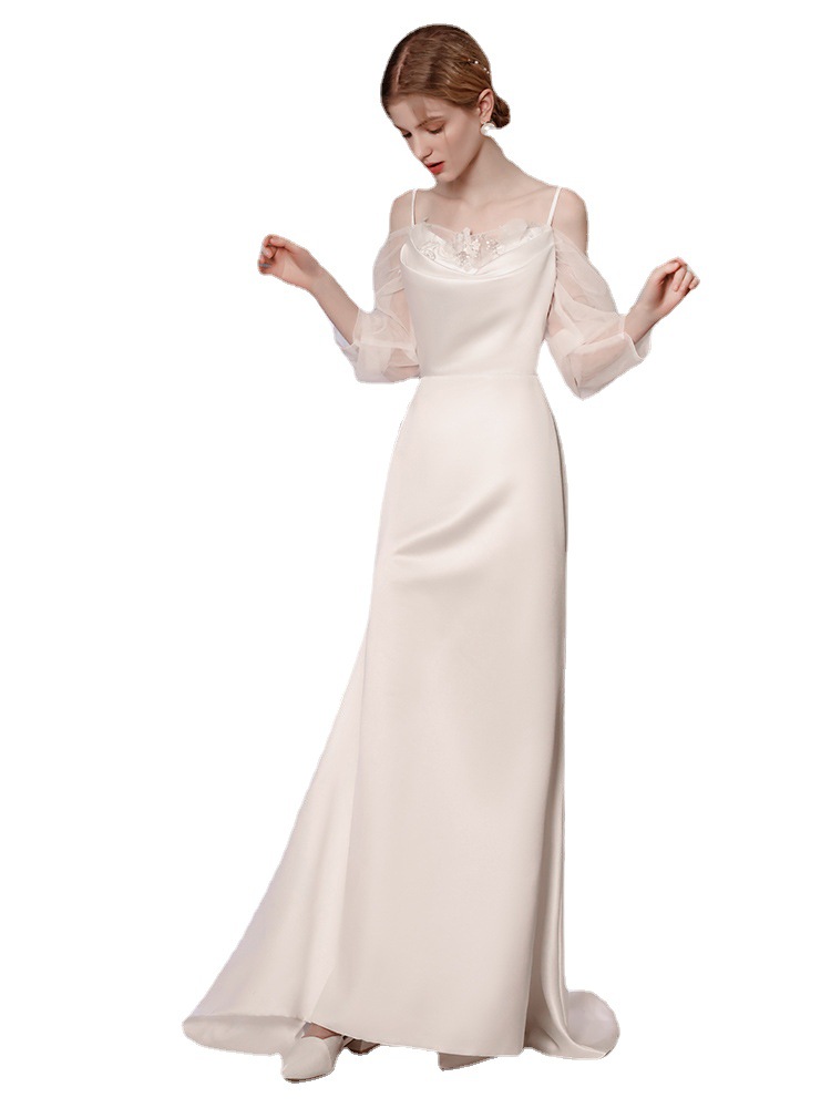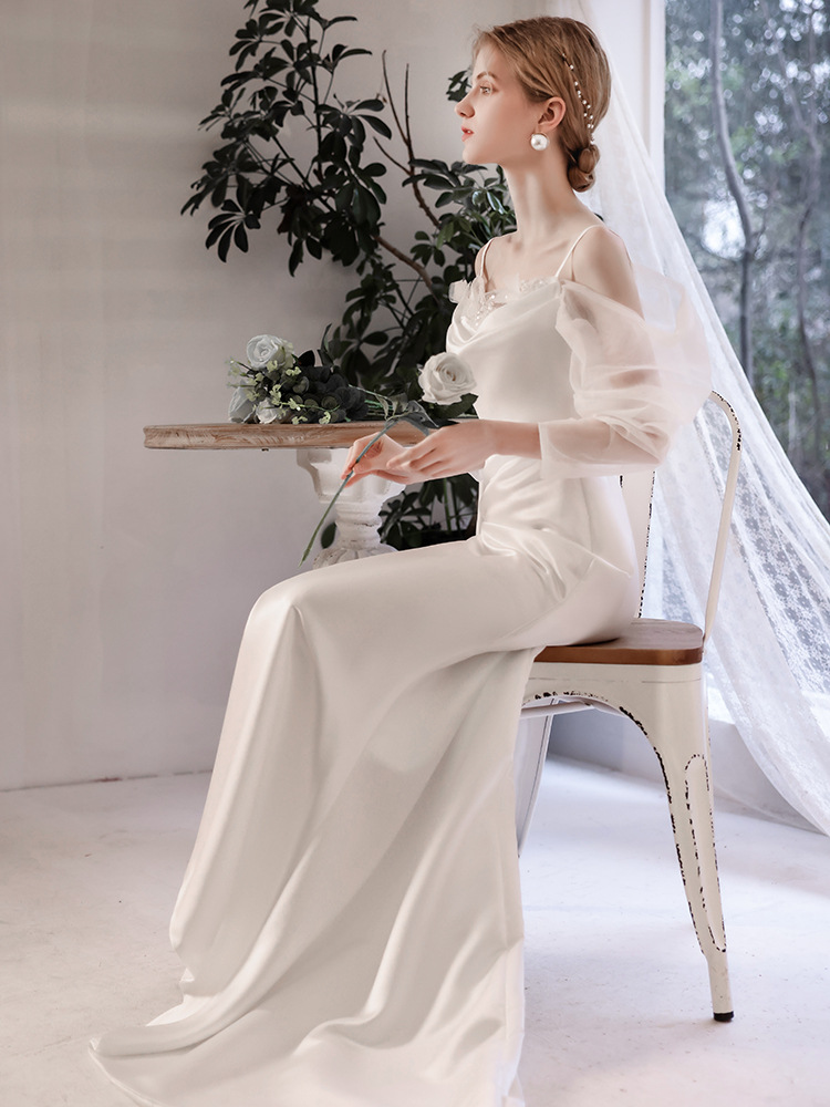 Korean Simple Light Wedding Dress Petite Bride Tube Top Satin Wedding Dress White Long-sleeved Dress For Women