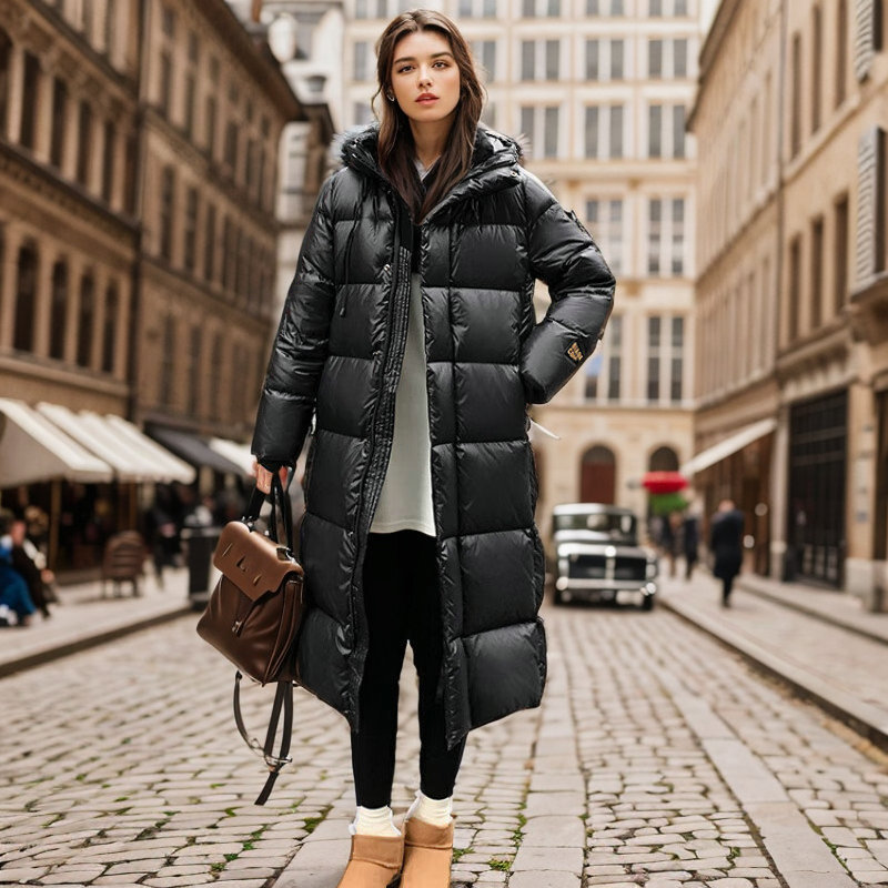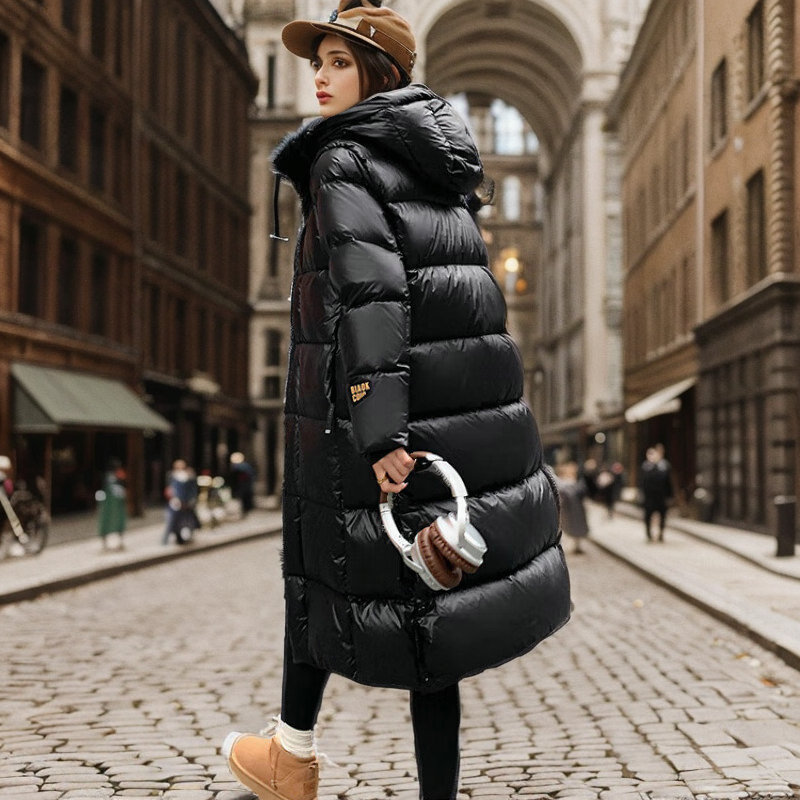 Black Gold Down Jacket Women's High-end Women's Winter Long Korean Style Pinghu Down Jacket Hooded White Duck Down Winter Jacket