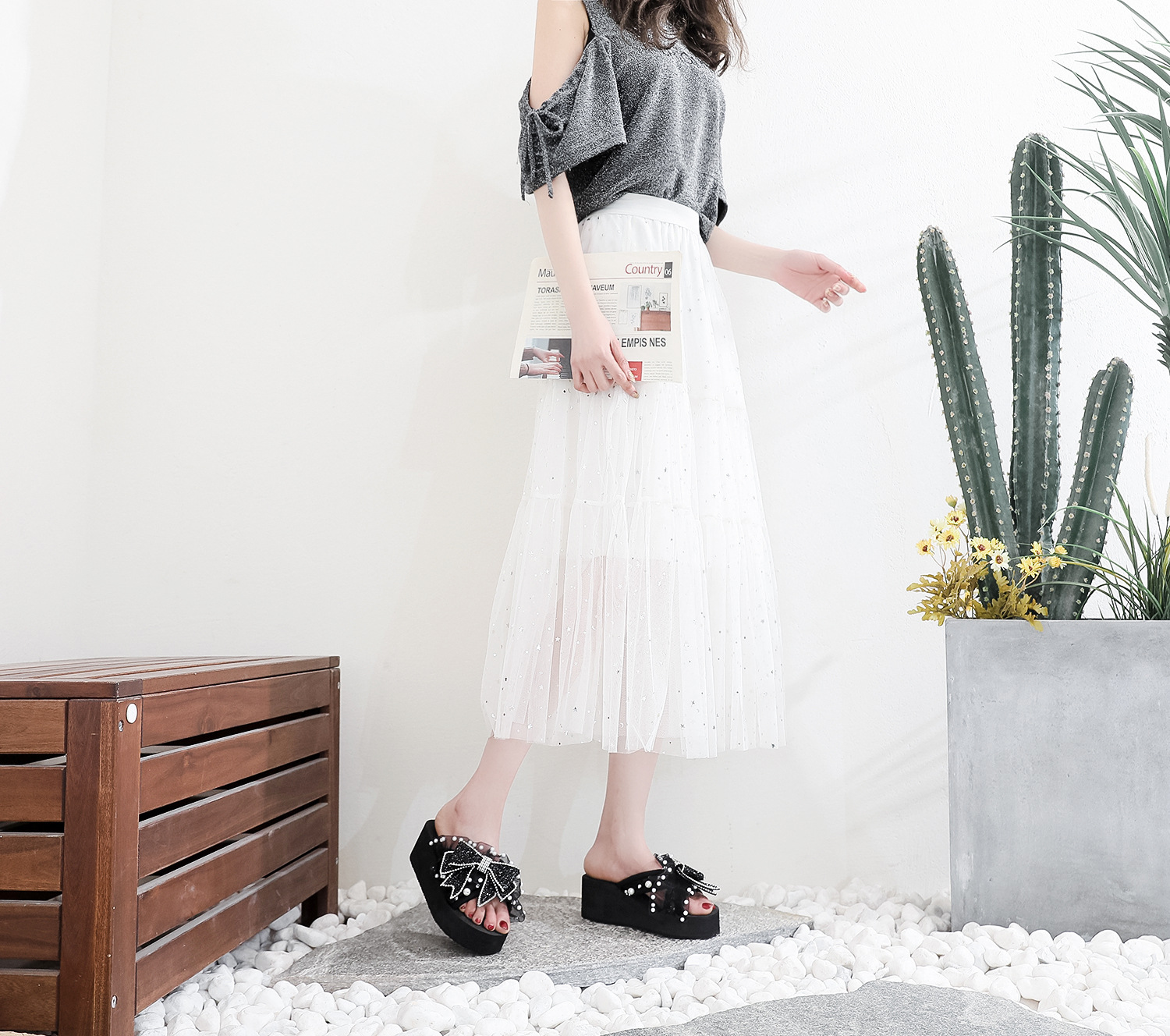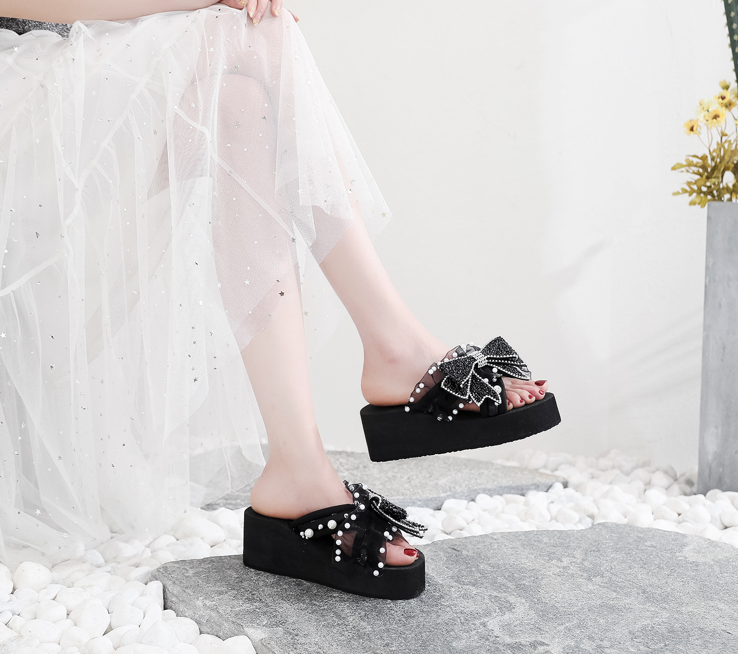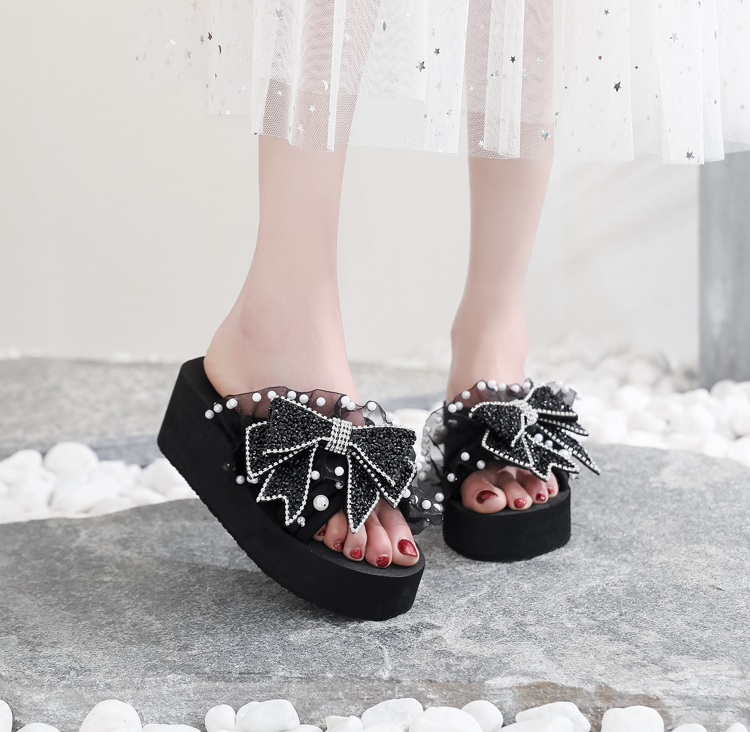 Slippers For Women To Wear Outside Summer Fashionable Shoes Pearl Bow Sandals Non-slip Wedge Heel Thick-soled Beach Slippers
