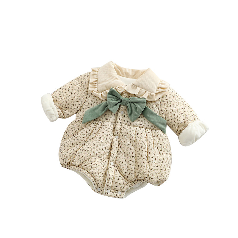 Korean Style Baby Girl's Quilted And Velvet Thickened Winter Cotton Clothing Infant And Toddler Floral Color Matching Khaki