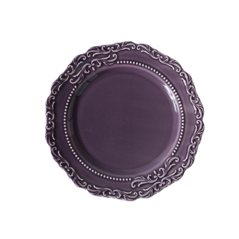 Nordic Style Round Tray Purple Embossed Dinner Plate Household Tiramisu Plate Ceramic Tableware Rice Bowl Dish Soup Noodle Bowl