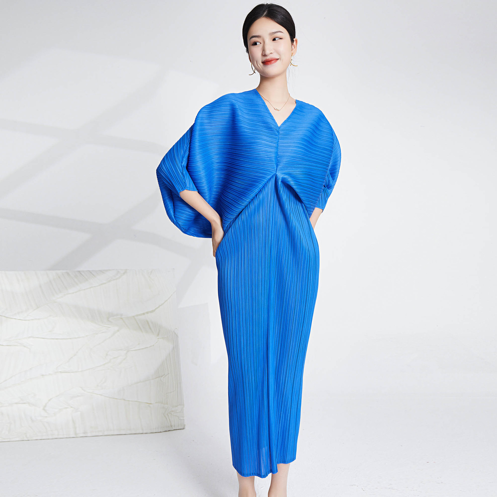 Women's Skirt Summer Temperament Fashion Loose Bat Sleeve V-neck Long Three-home Pleated Dress