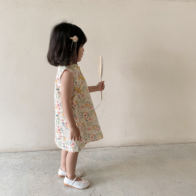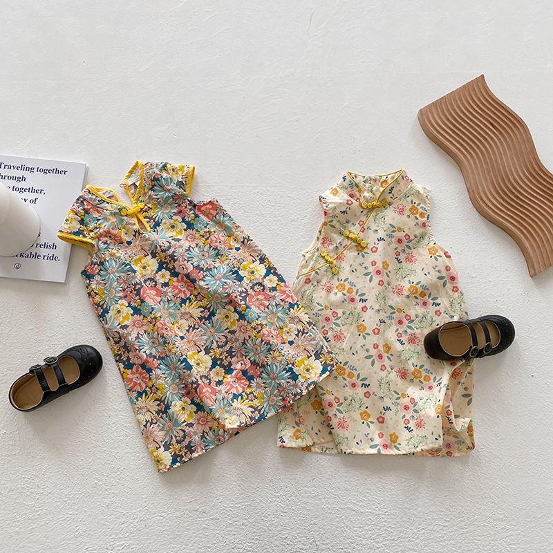 Girls Floral Sleeveless Cheongsam Chinese Style Baby Dress Official Lady Princess Dress Western Style Improved Cheongsam