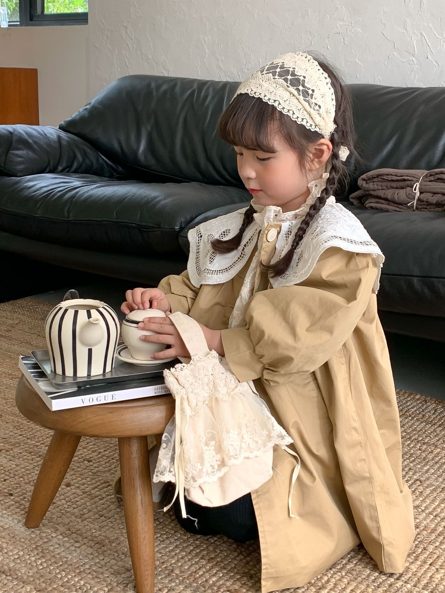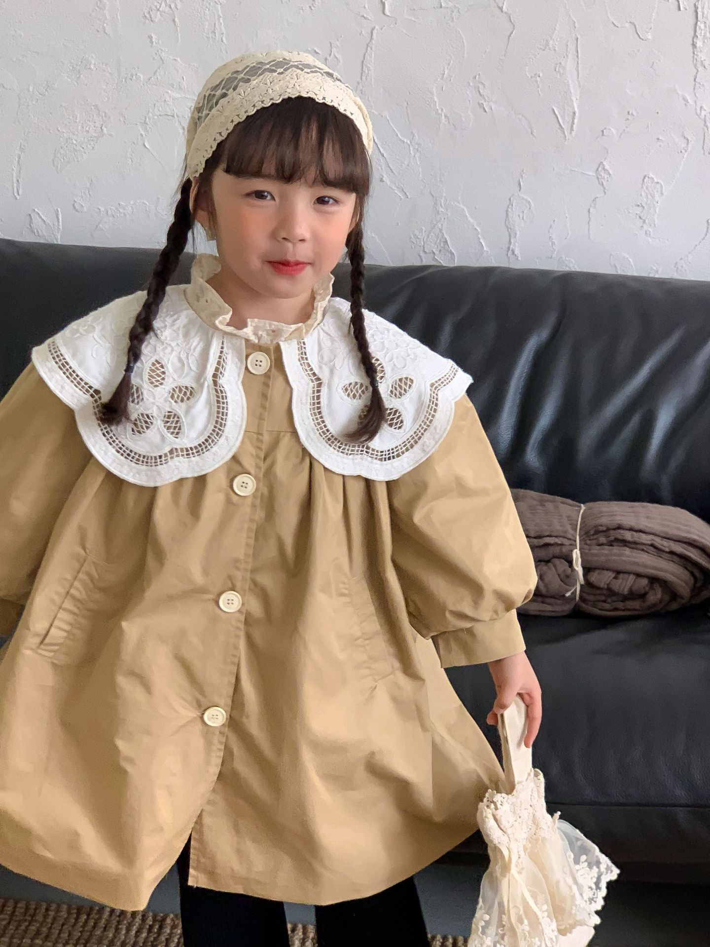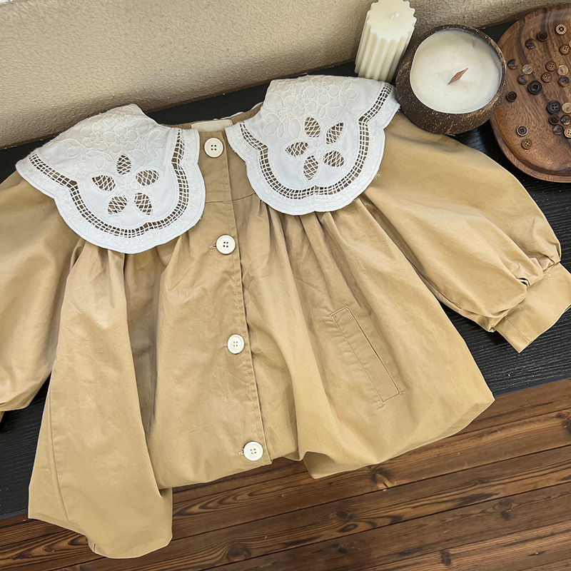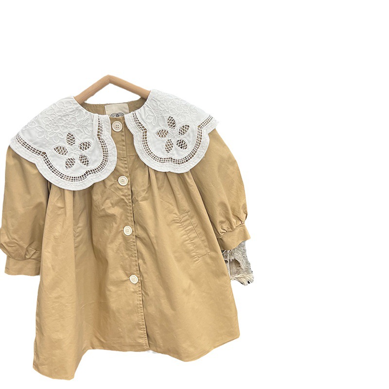 Wheat Field Season Autumn And Winter Korean Style Children's Clothing Girls Large Lace Collar Windbreaker Mid-Length Jacket Children's Windbreaker