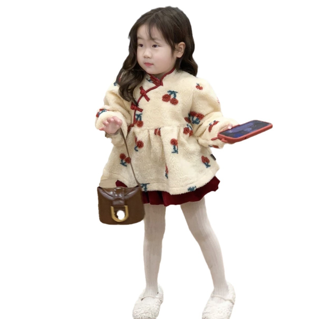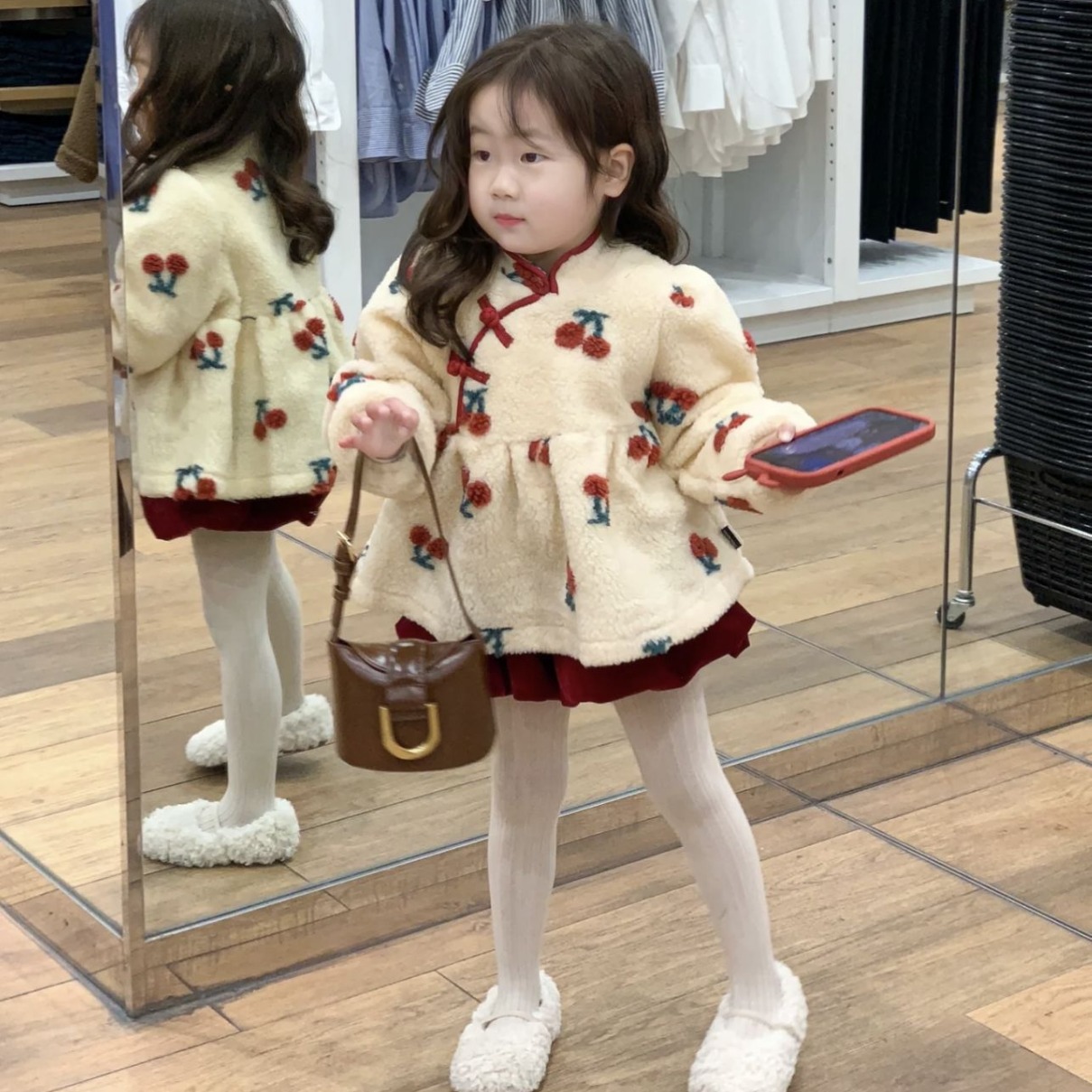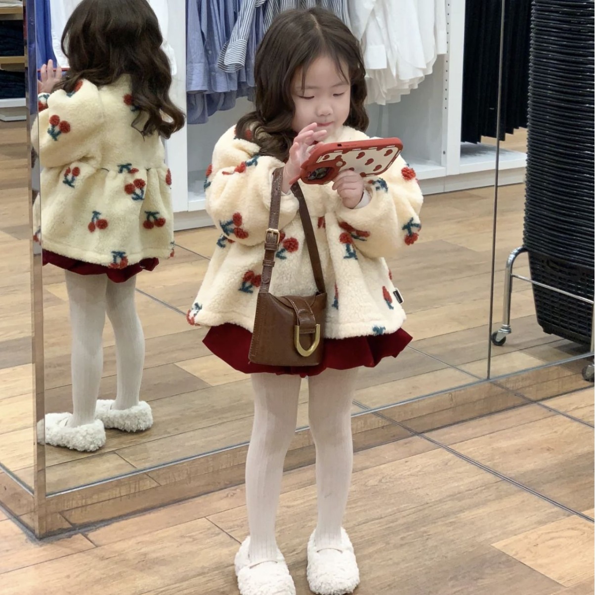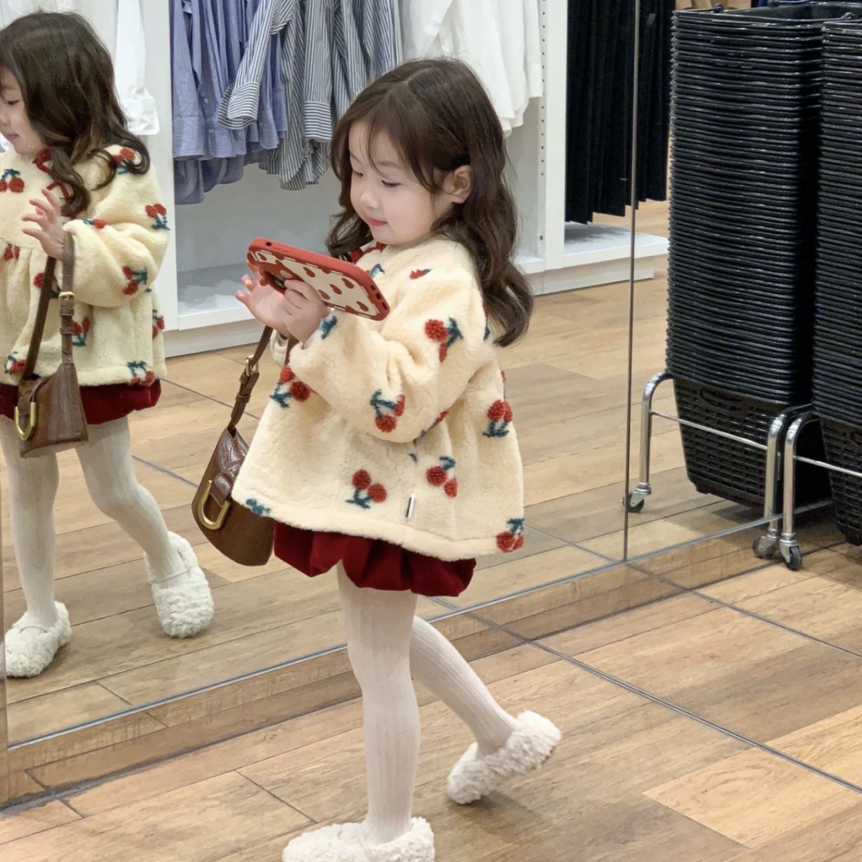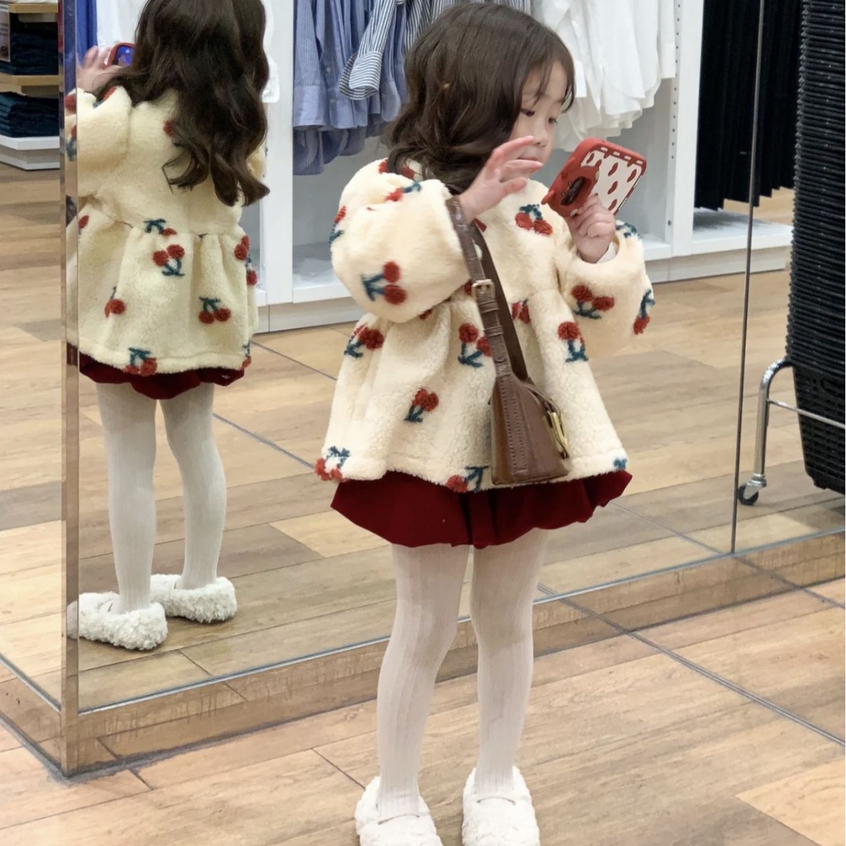 Wheat Field Season Girls'Double-sided Cherry Jacquard Lamb Velvet Jacket Autumn And Winter Warm Red Velvet Plus Velvet Bloomers