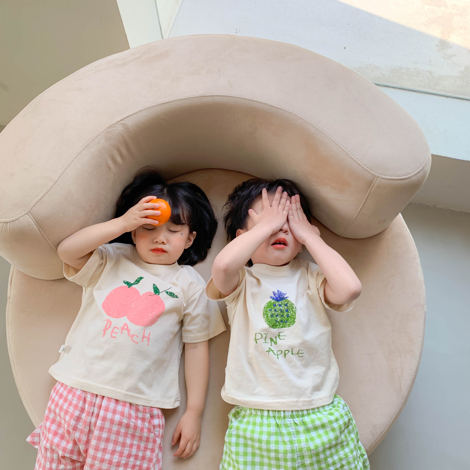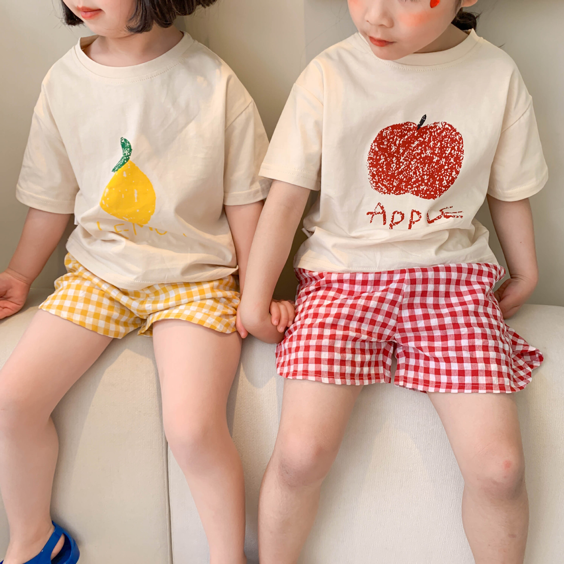 Wheat Field Season23 Summer Korean Children's Suit Children's Fruit Short-sleeved T-shirt Cotton Plaid Shorts Baby Suit
