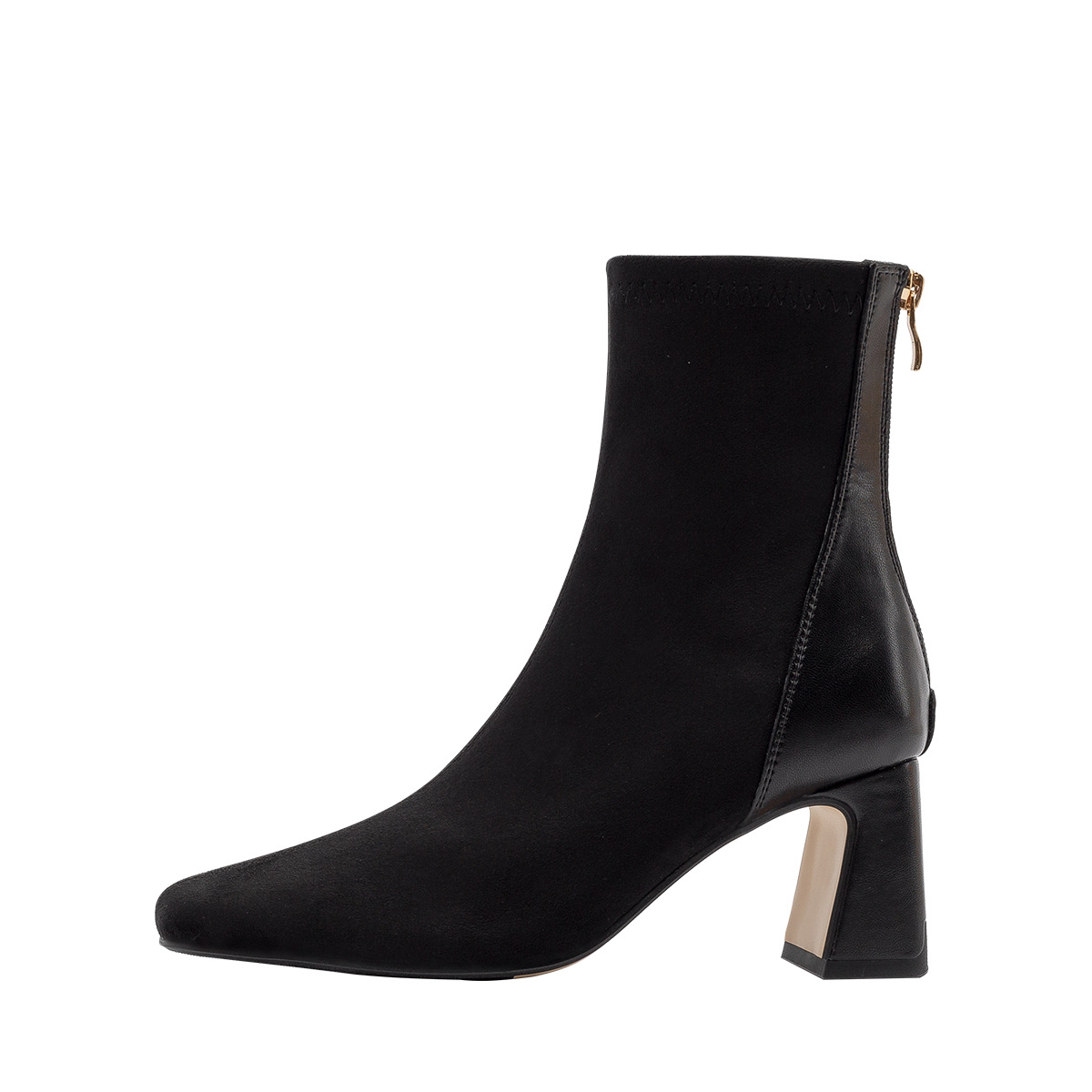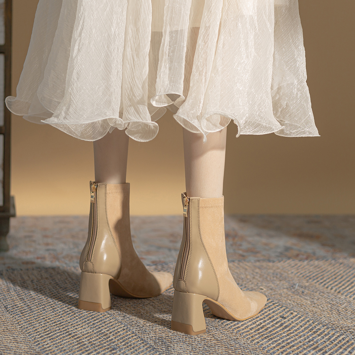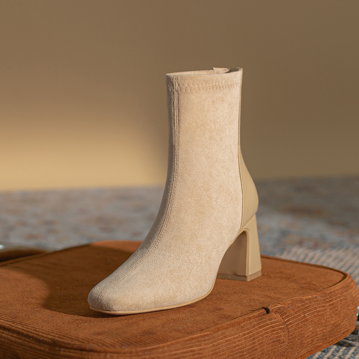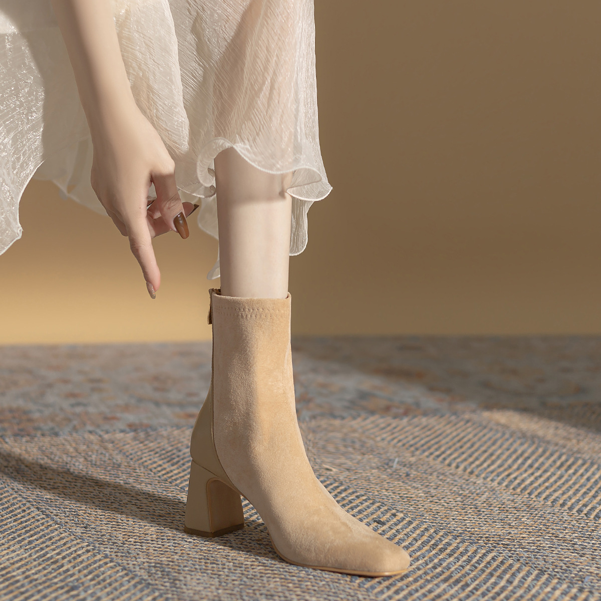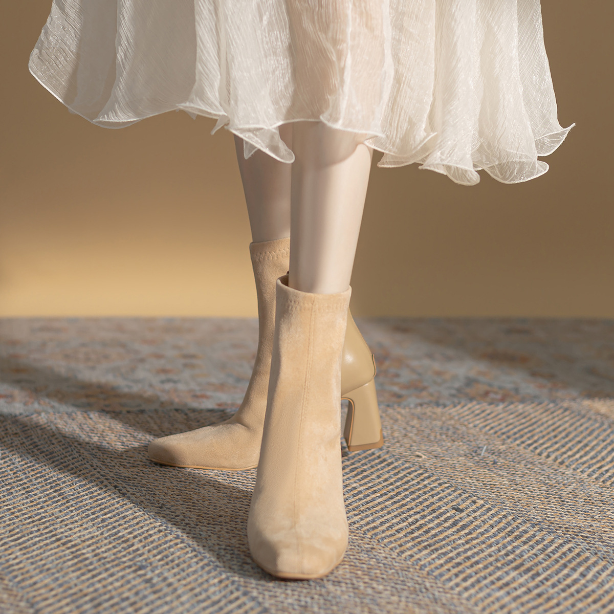 Thick High-heeled Elastic Slim Boots For Women Genuine Leather Socks Boots For Women Square Toe And Naked Short Boots Autumn And Winter Suede