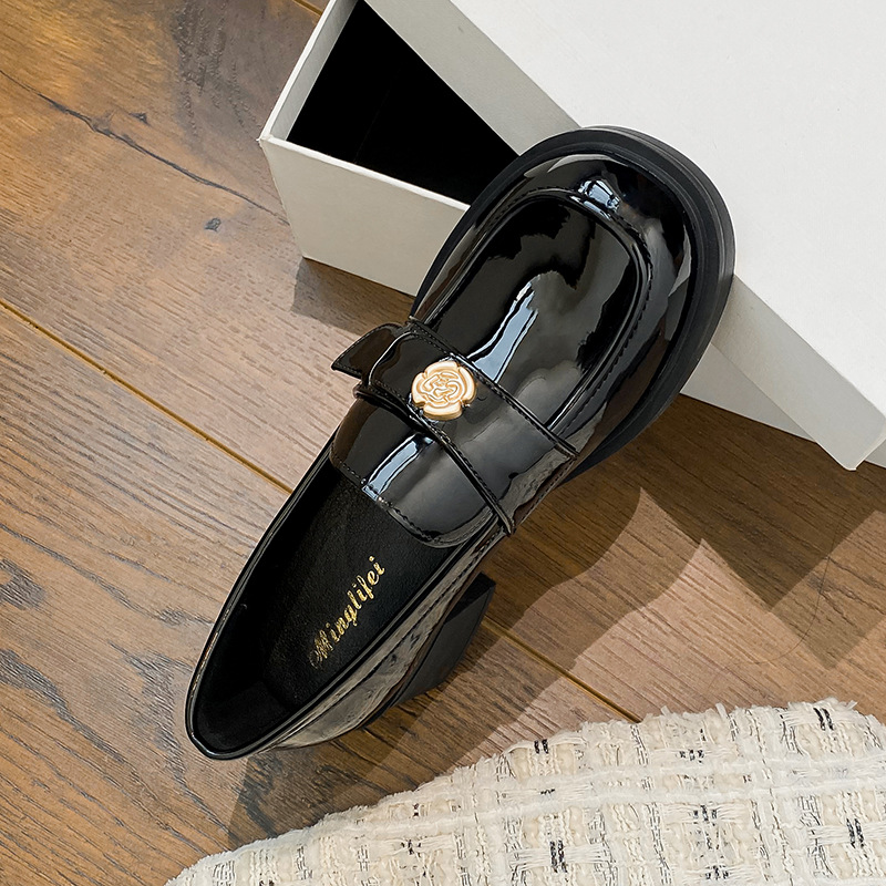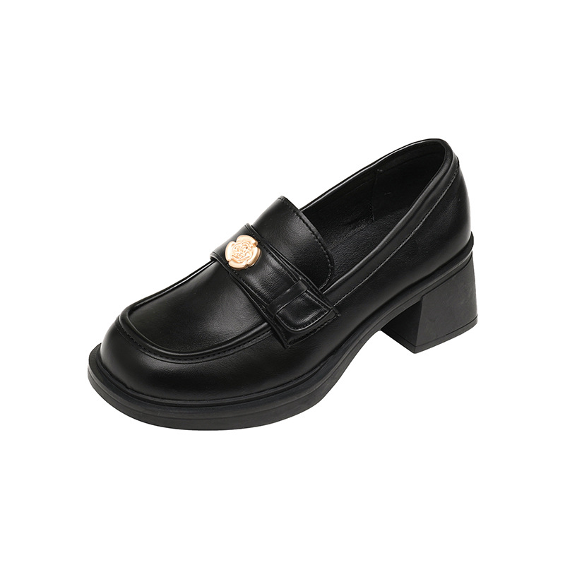 Camellia Thick Soled Loafers Women's British Style Gold Coin Small Leather Shoes Retro Slip-On Thick Heels Single Shoes