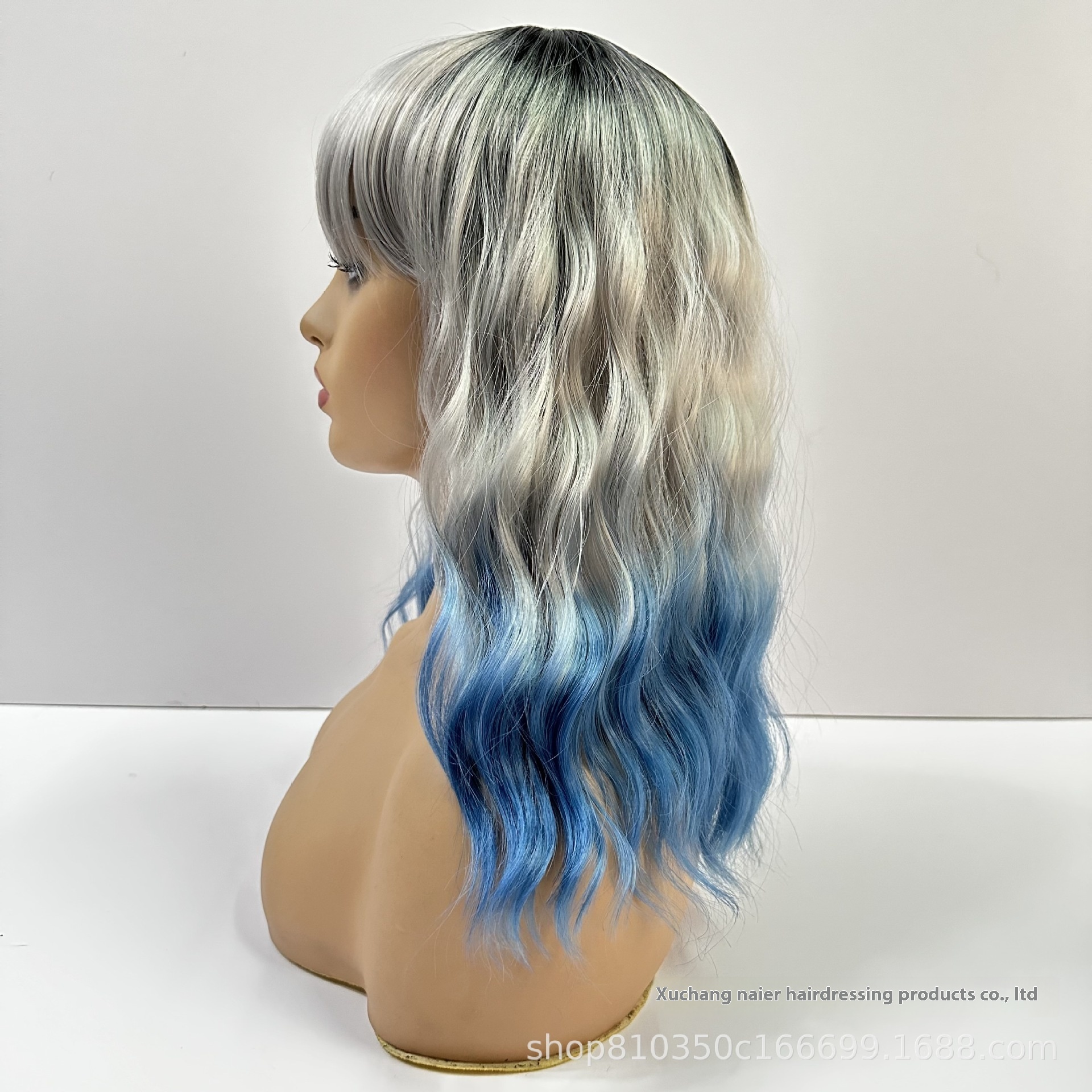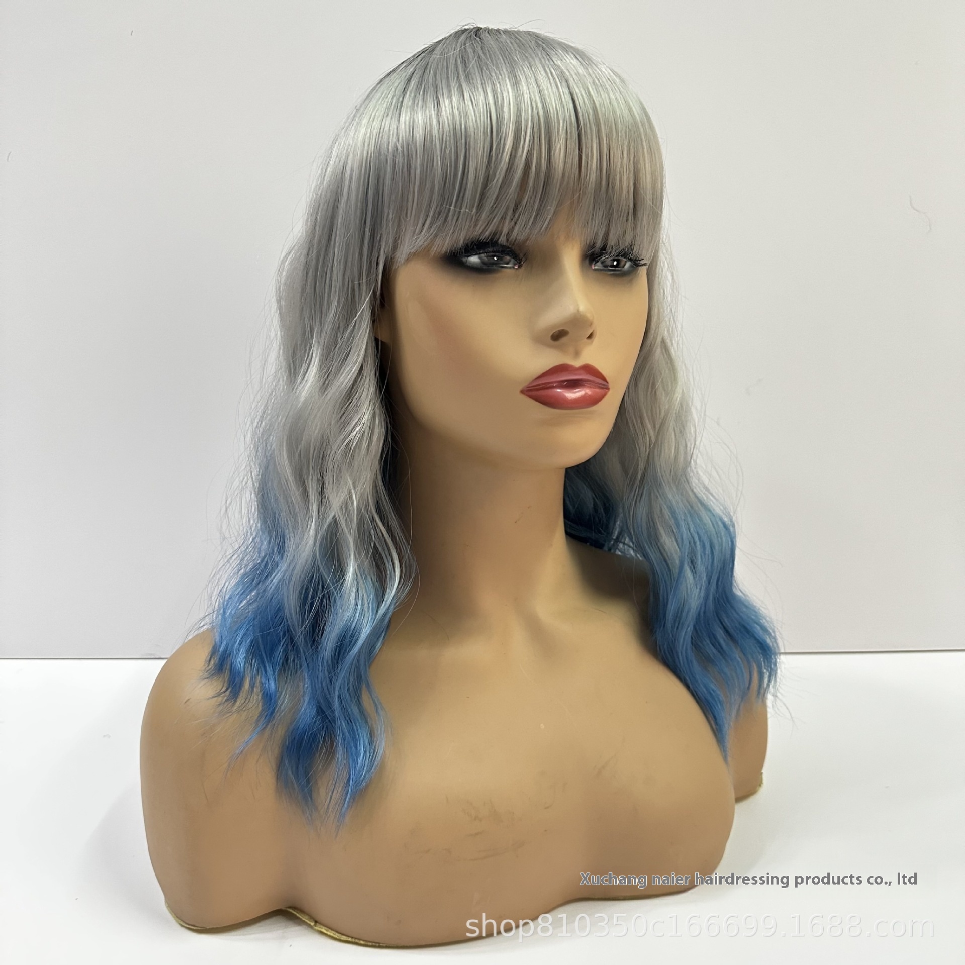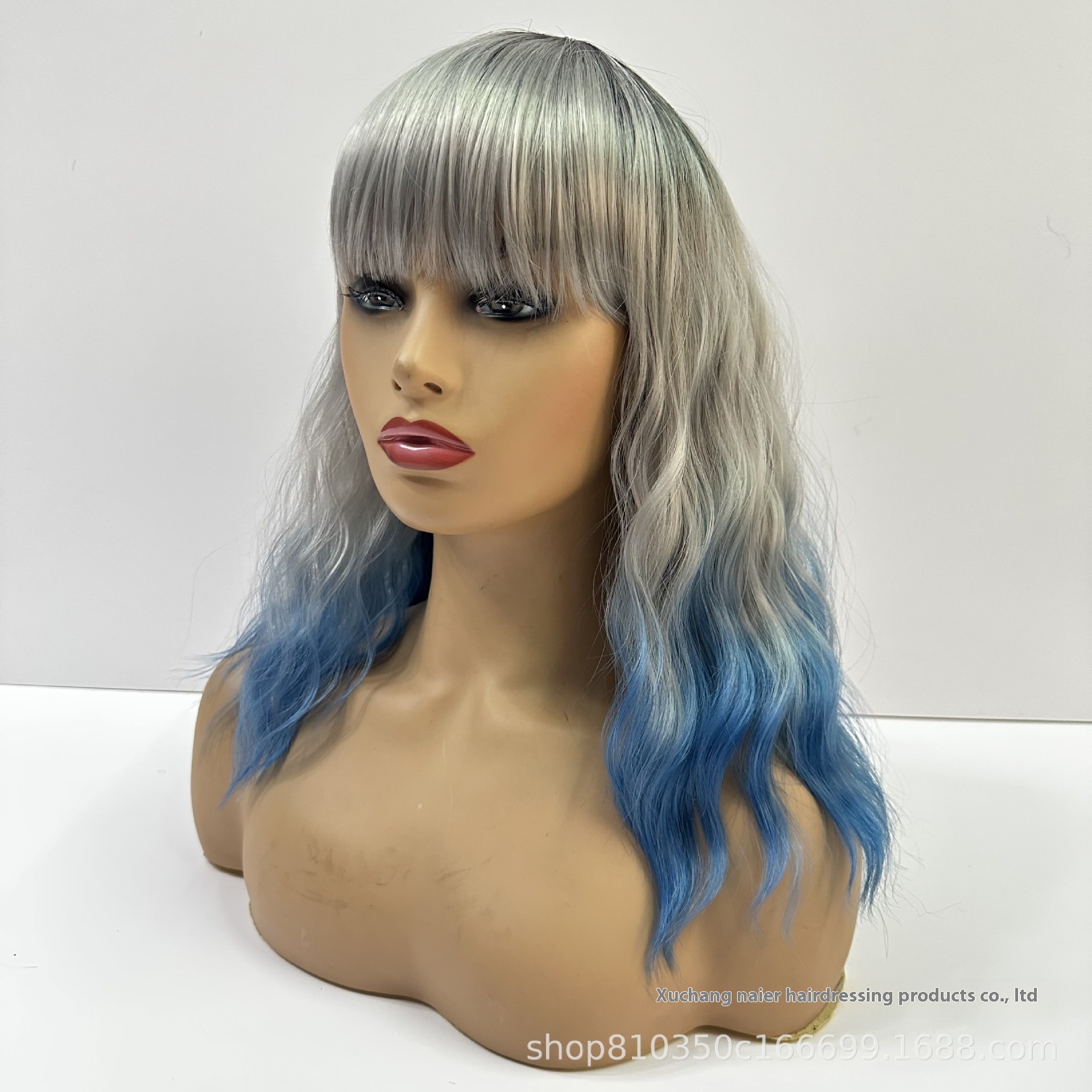 European And American Wigs For Women With Dyed Gradient Short Curly Hair, Black, Gray And Blue3-color Chemical Fiber High-temperature Silk Fashionable Ombre With Bangs