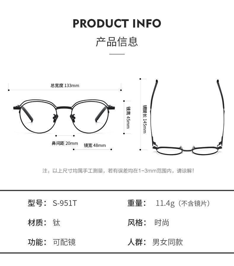 Designer Pure Titanium Glasses Frame9999 S-951 TSmall Face Full Frame Douyin Hot Style Personalized Glasses Frame