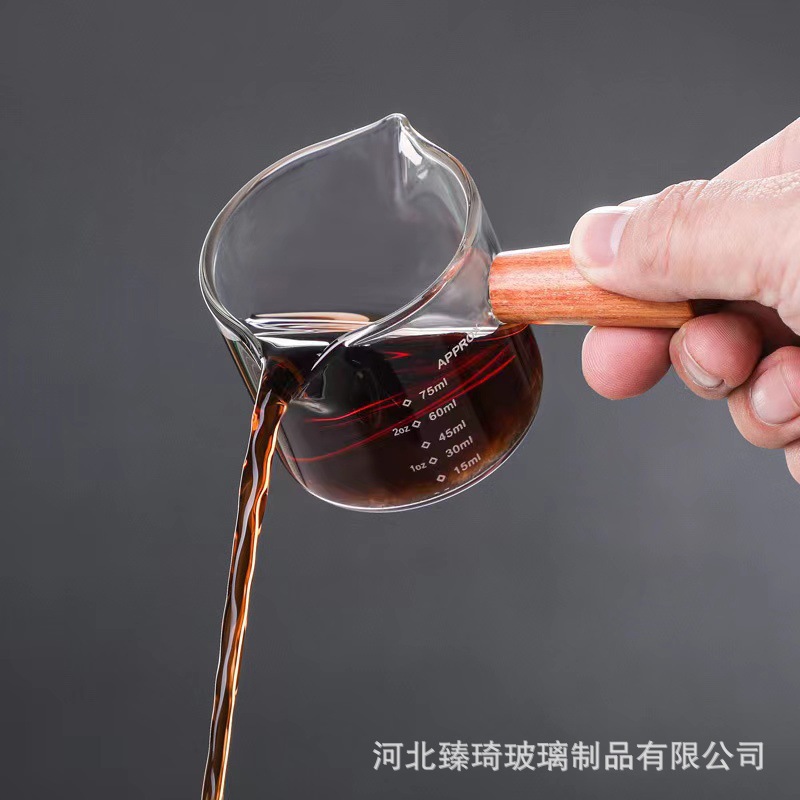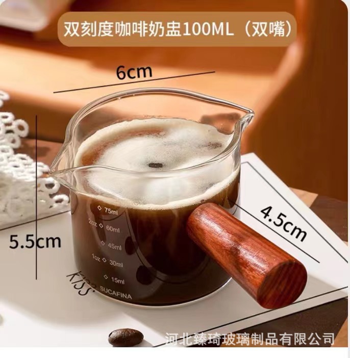Glass Small Milk Cup With Wooden Handle,Transparent Coffee Glass Cup,Double Mouth With Graduated Measuring Cup,Mini Small Milk Jug